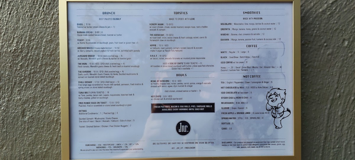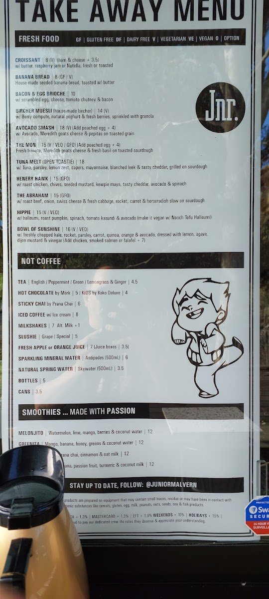 The menu at Junior Malvern offers a variety of options suitable for breakfast, coffee breaks, and light meals. Visitors can find a selection of coffee and fruit juices along with a range of food items including pastries, toasties, and baked goods.